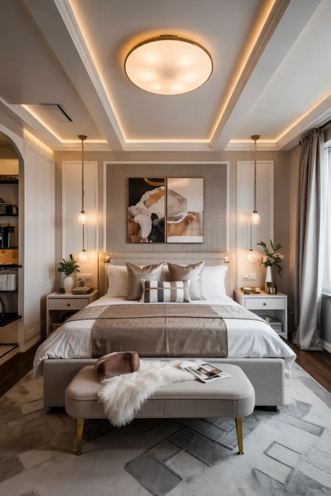 Soft-close drawers make daily use smooth and quiet. This idea balances luxury and efficiency, making tiny bedrooms feel polished and cozy.
