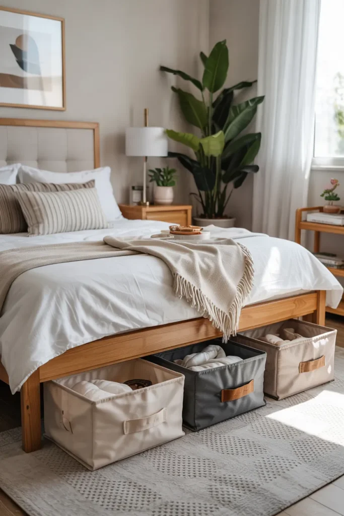 IKEA-style under-bed boxes are affordable, modular, and renter-friendly. They fit seamlessly under most beds and keep items neatly organized.