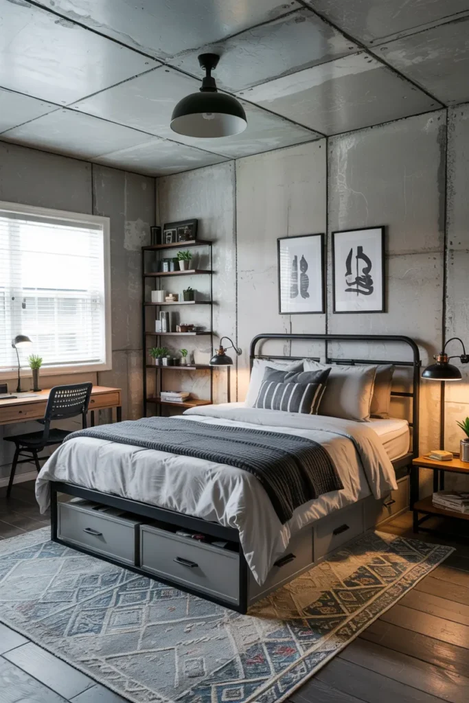 Metal drawers paired with an industrial bed frame offer durability and a bold urban look. They’re perfect for heavier items like shoes or tools.
