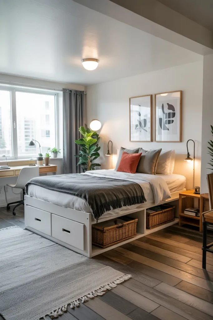 In studio apartments, a bed with under-bed drawers becomes a central storage hub. It reduces the need for extra furniture and keeps essentials organized.
