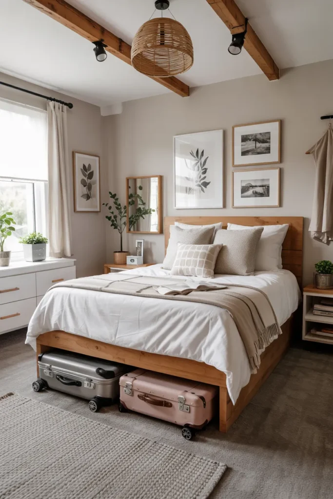 Suitcases stored under the bed double as storage for off-season clothes or travel essentials. Wheels make them easy to access.