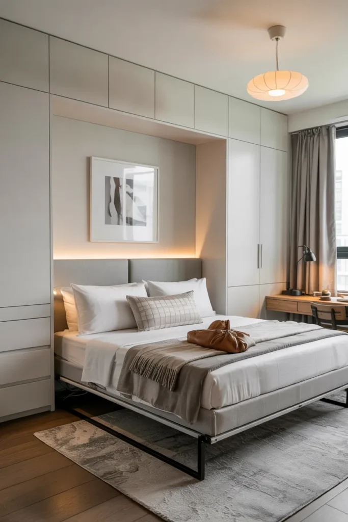 A Murphy bed with hidden storage is ideal for studios or ultra-small bedrooms. When lowered, discreet compartments provide space for bedding or clothing.