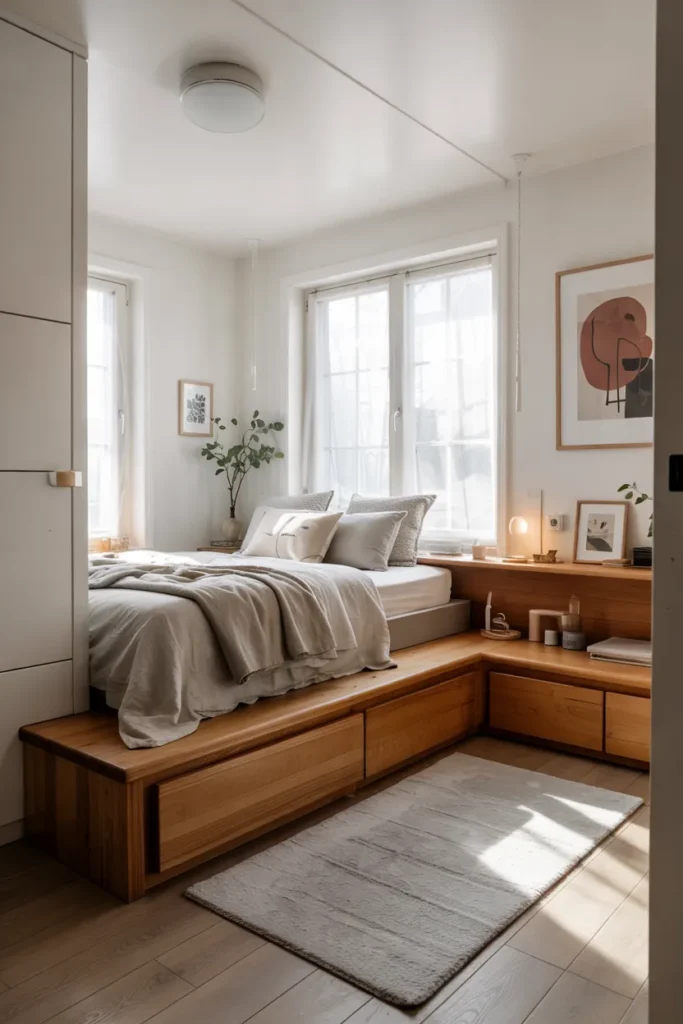 A platform bed with built-in drawers is one of the most practical solutions for tiny bedrooms. The low-profile design keeps the room visually open while offering generous hidden storage for clothes, linens, or seasonal items. Light wood tones and neutral bedding help maintain a calm, airy feel.