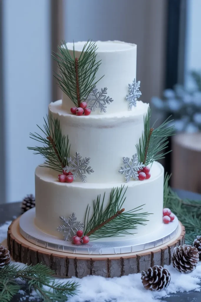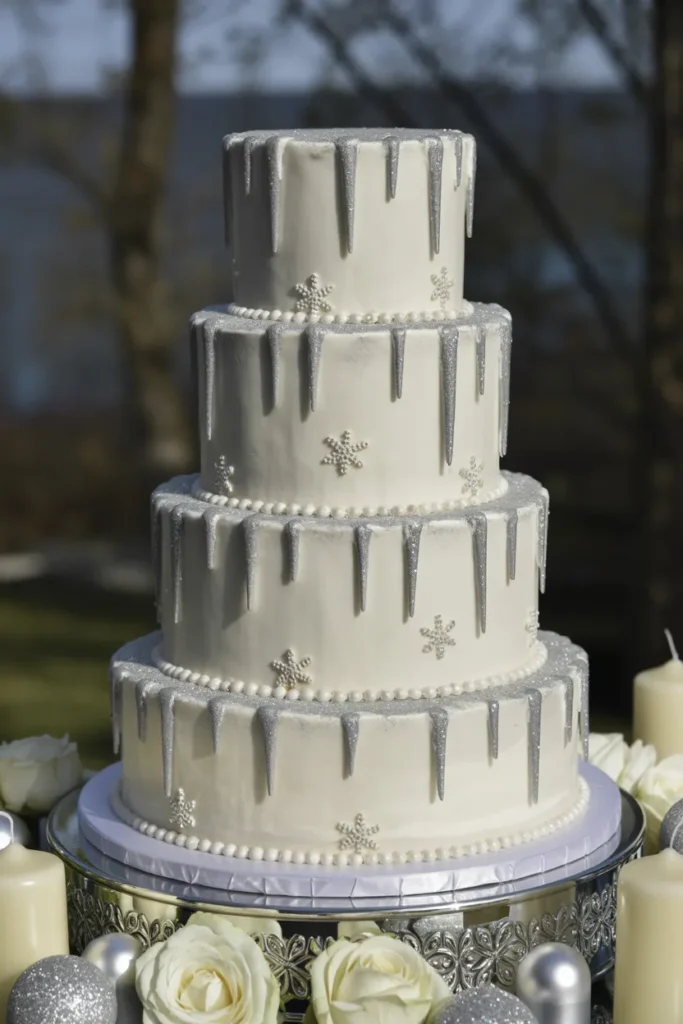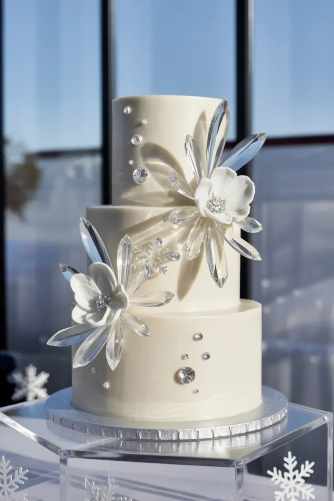 Every layer glistens like morning frost, and the handmade snowflakes add a magical touch. It’s the perfect blend of nature and elegance — a winter design that feels festive yet sophisticated, especially in daylight settings.