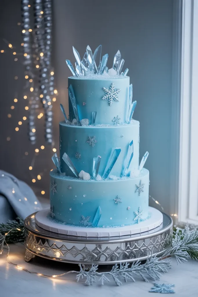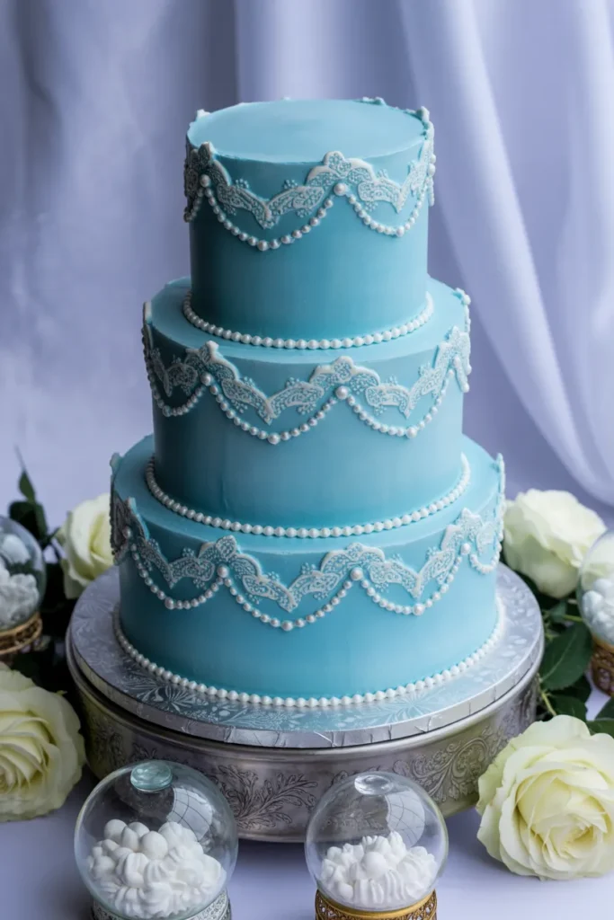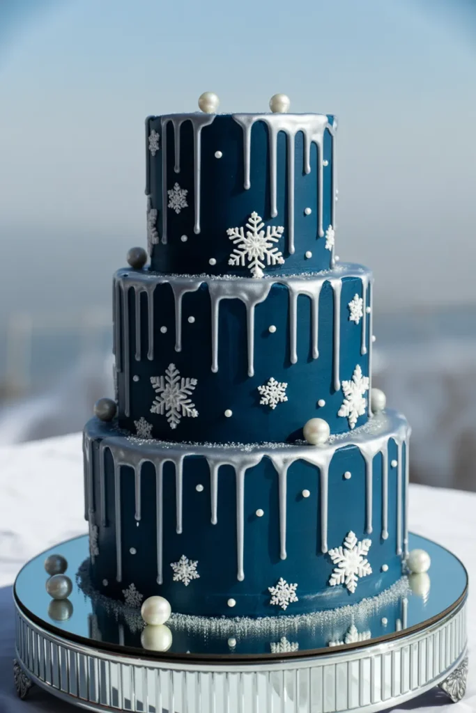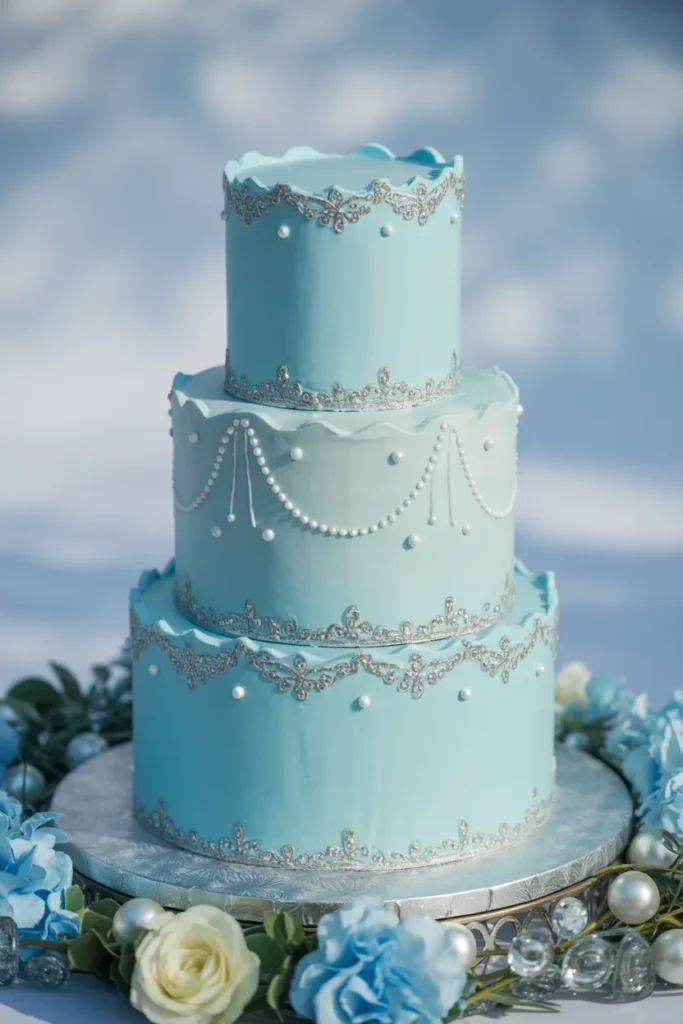 With its reflective silver tones and glowing pearl touches, this cake photographs beautifully for Pinterest. It’s not just a dessert — it’s the centerpiece that defines your winter wonderland theme with glamour and sparkle.