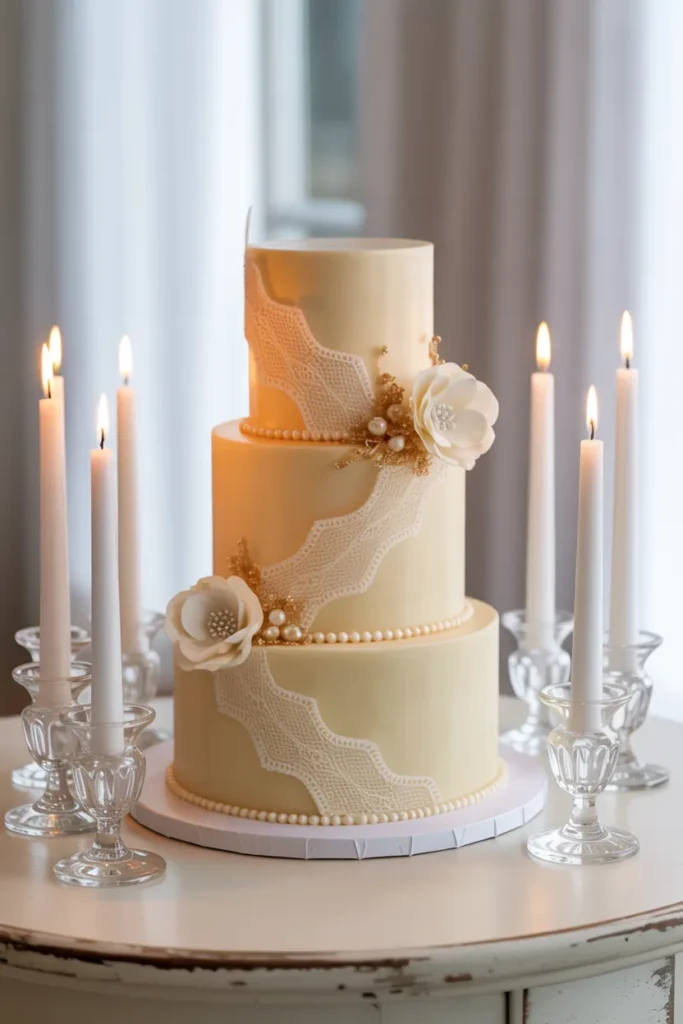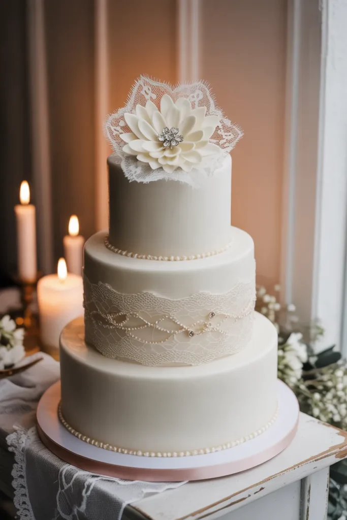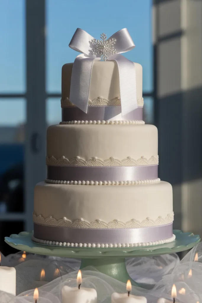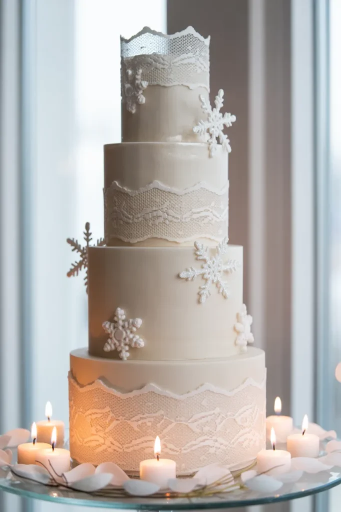 This romantic candlelight cake captures the essence of winter warmth. The ivory fondant and delicate lace make it soft and timeless, while the surrounding candles create a glowing, magical atmosphere. It’s ideal for evening receptions or intimate weddings.