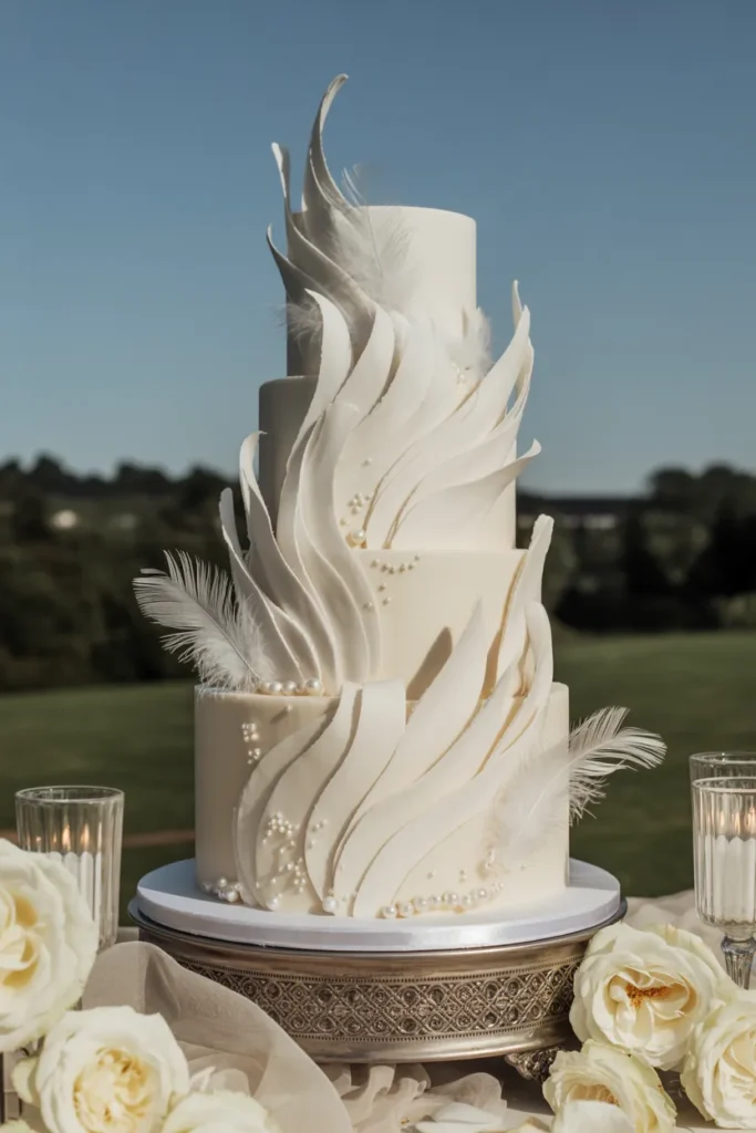 The White Swan cake is the picture of graceful beauty and bridal luxury. Its feather-inspired sugar design gives it a soft, ethereal charm — perfect for brides who adore fairytale elegance. Each tier flows seamlessly into the next, resembling swan wings in gentle motion.