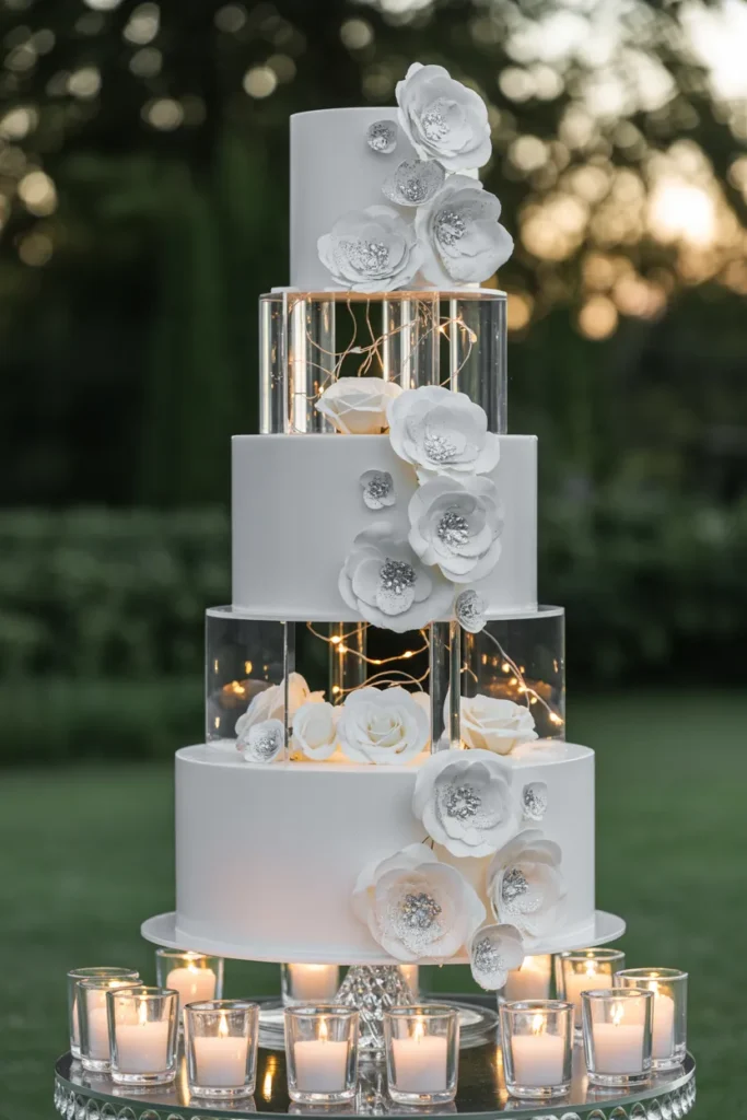 The Frosted Floral Cascade cake is the ultimate showstopper — a glowing tower of white flowers and shimmering details. The clear floral spacers give it a floating illusion, making it look like it’s suspended in light.