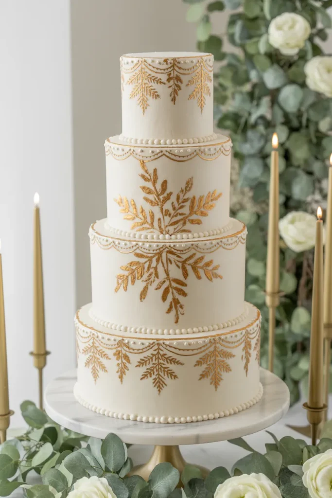 This white and gold winter glam cake exudes luxury from every angle. The full-tier design allows each layer to shine, reflecting golden tones under natural daylight. It’s a masterpiece that combines simplicity with regal charm — perfect for high-end winter weddings in 2025.