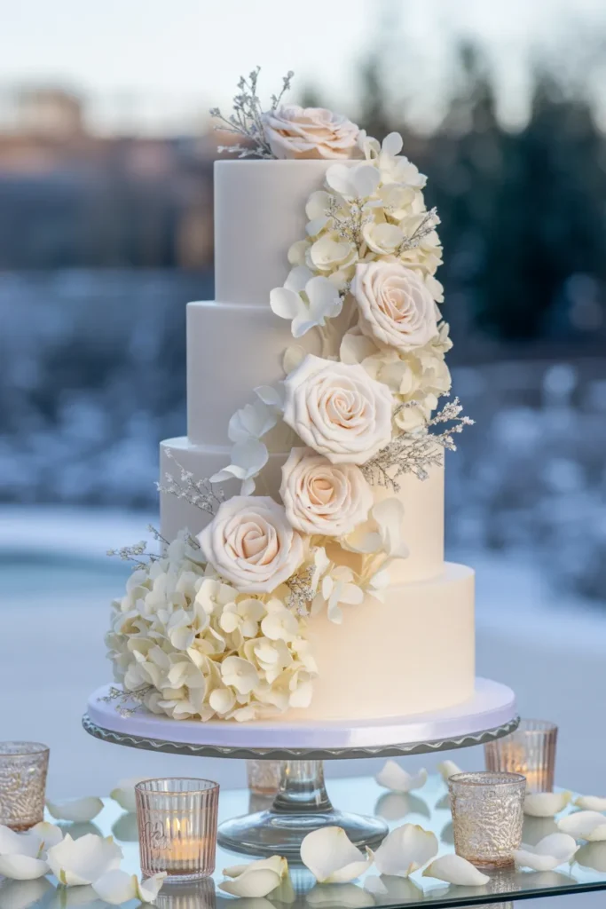 This snowy rose cascade cake embodies pure romance and timeless winter charm. The delicate sugar flowers flow gracefully down the tiers like soft falling snow, creating a fairytale look perfect for an elegant indoor or garden winter wedding.