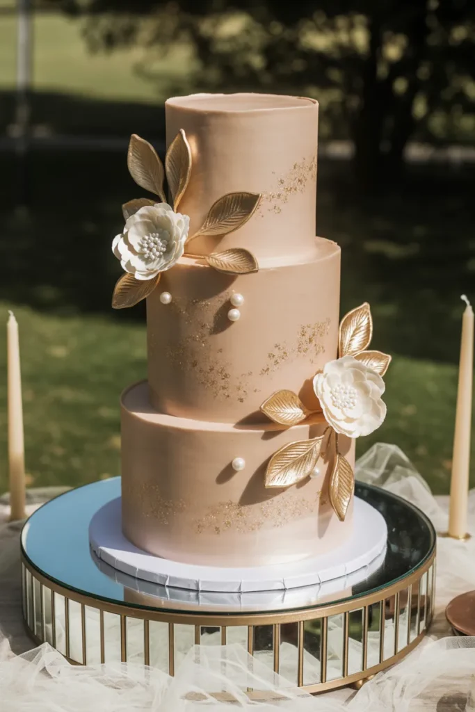 Each tier glows under natural light, and the silver leaf accents add just the right amount of sparkle. It’s a design that feels modern yet soft — perfect for Pinterest brides who love a balance of romance and elegance.