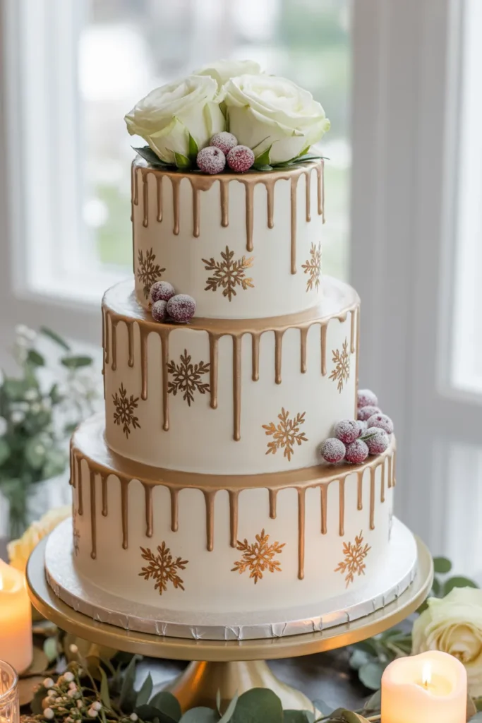 The golden drip design adds a modern twist to classic winter cakes. Combined with frosted berries and floral details, it captures the feeling of sunlight hitting fresh snow — a perfect Pinterest-worthy masterpiece for your special day.