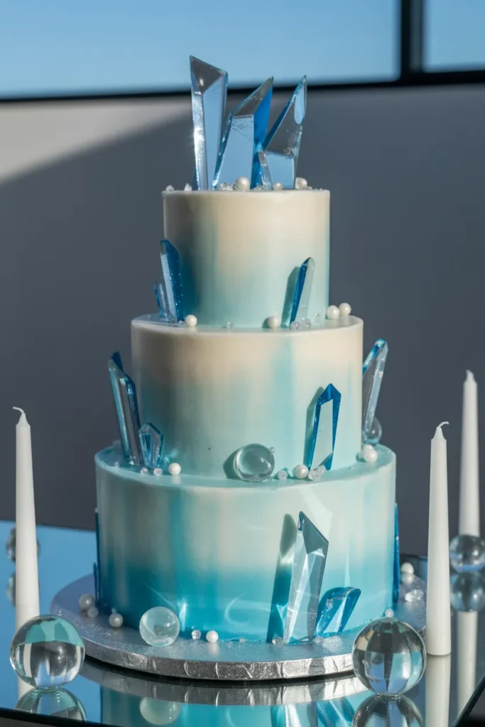 The blue-white glaze creates an ethereal glow, while the crystal shards add bold visual appeal. This cake is perfect for brides who want something truly one-of-a-kind and Instagram-ready, shimmering in daylight like frozen magic.