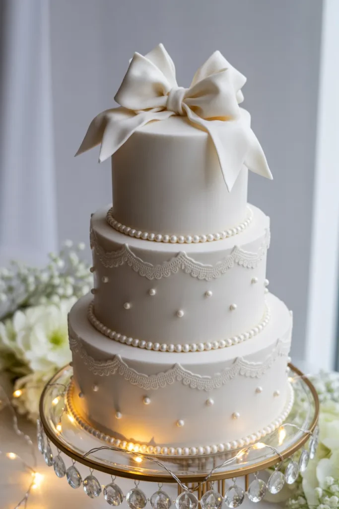 Each pearl is placed with precision, adding texture and depth to the smooth fondant. The frosted sugar bow ties the look together, giving it a delicate, romantic charm that photographs beautifully for Pinterest or Instagram.