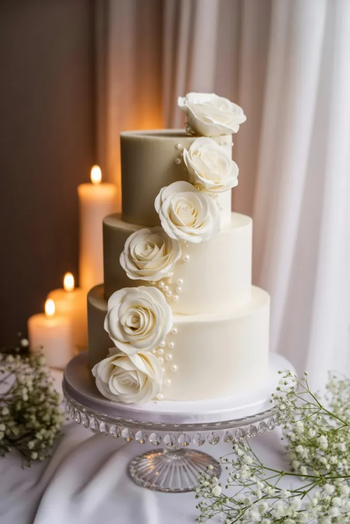 Nothing says timeless elegance like an all-white wedding cake. This full-tier design, with its delicate sugar roses and soft pearl details, brings romantic minimalism to perfection. It’s perfect for brides who want their celebration to feel classic and graceful.