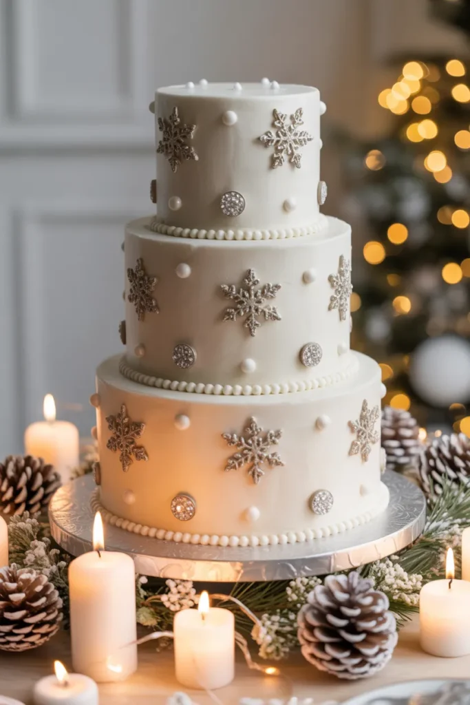 From the hand-painted snowflakes to the edible pearl detailing, this cake feels like a piece of royal art. The mix of gold accents and soft white fondant captures a golden-hour glow, making it one of the most Instagram-worthy designs for the winter season.