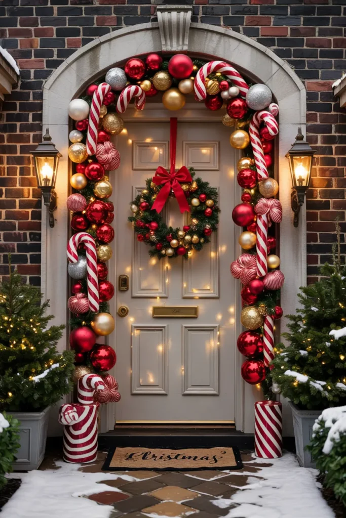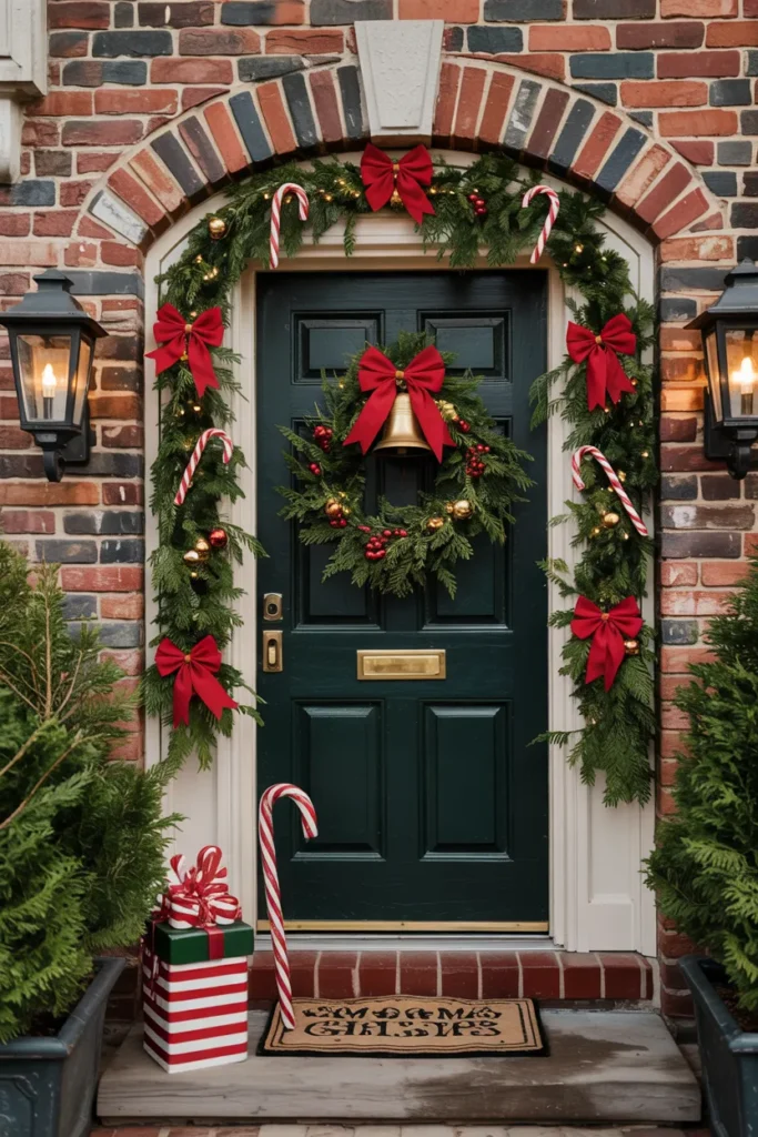 Candy canes paired with bells create a lively and traditional holiday look. The combination adds both visual charm and a sense of joyful movement, making the entrance feel full of spirit.