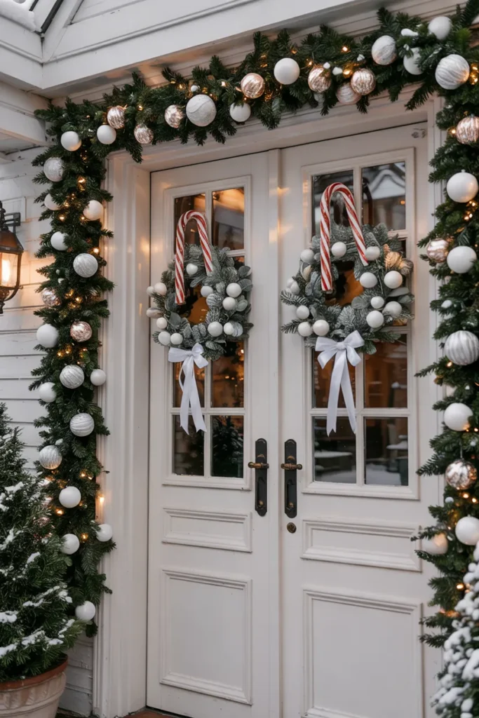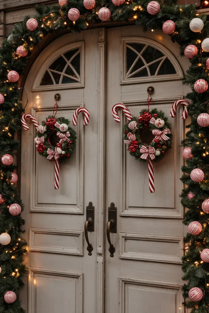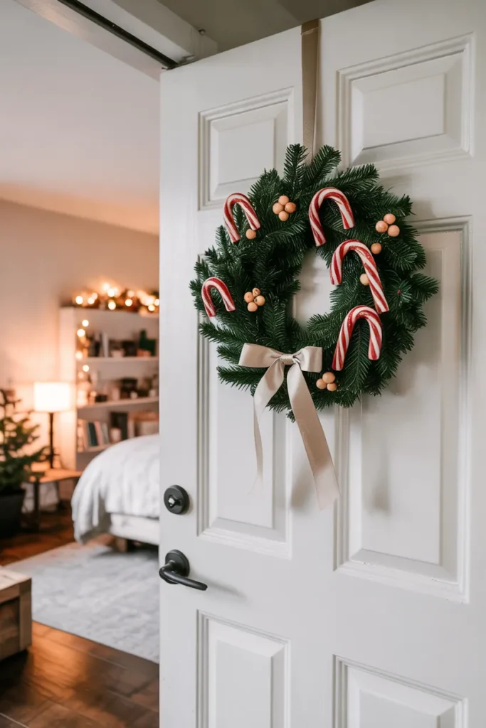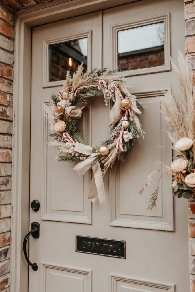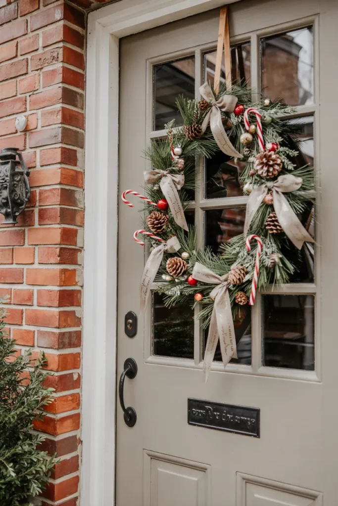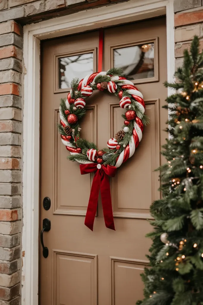 A candy cane wreath makes a strong yet simple holiday statement. Placed at the center of the door, it instantly draws attention while keeping the overall design clean. Natural accents soften the bold stripes, creating harmony.