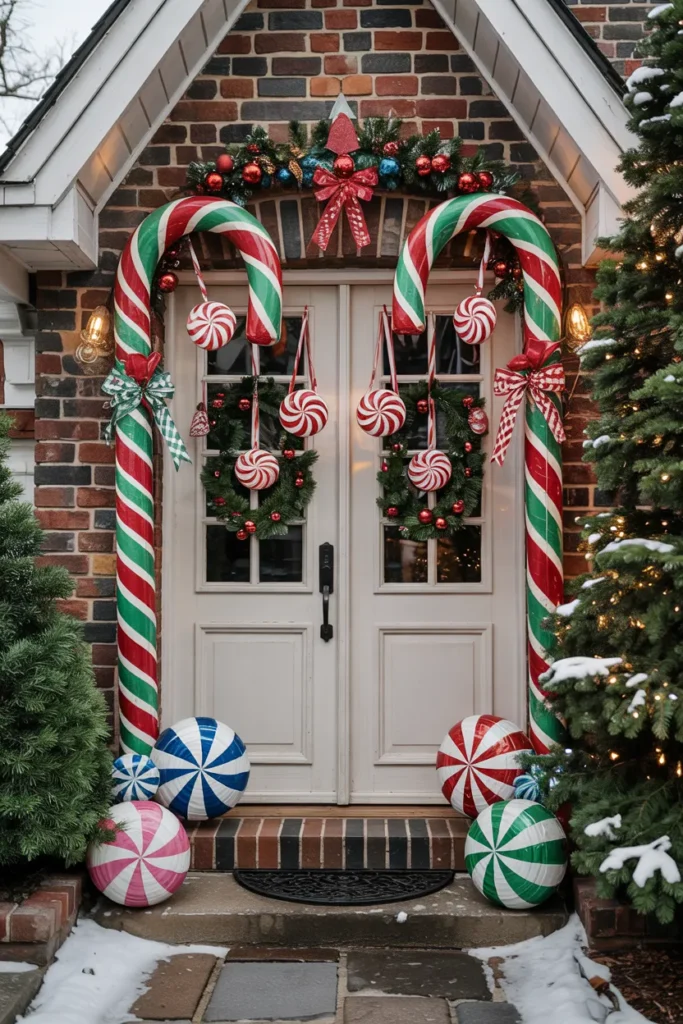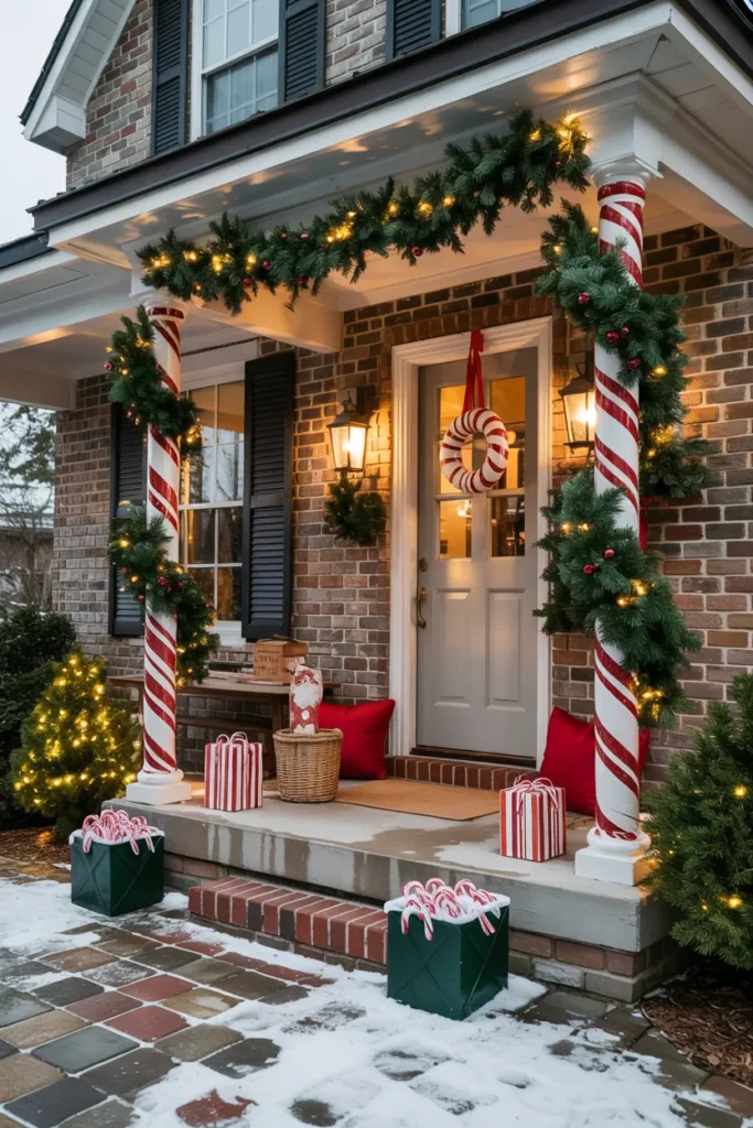 Wrapping porch columns in candy cane stripes adds playful impact to the entire entrance. The design extends beyond the door, creating an immersive and joyful holiday look that’s noticeable from afar.