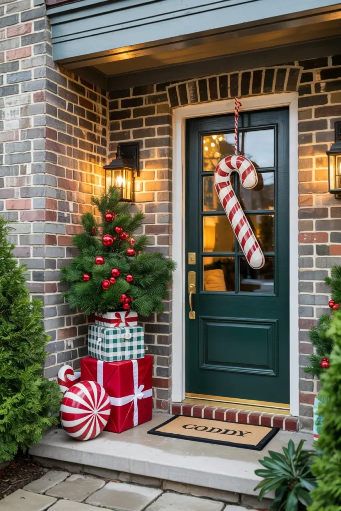 A dark door paired with candy cane decor creates striking contrast. The bold background allows festive details to stand out beautifully. Clean lines keep the design modern and fresh.