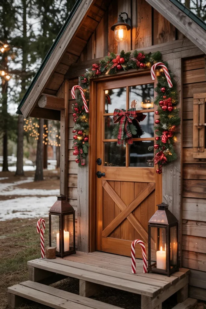 This cabin-inspired candy cane door feels warm and comforting. Natural materials and traditional accents create a nostalgic holiday atmosphere. The overall design feels peaceful and grounded.