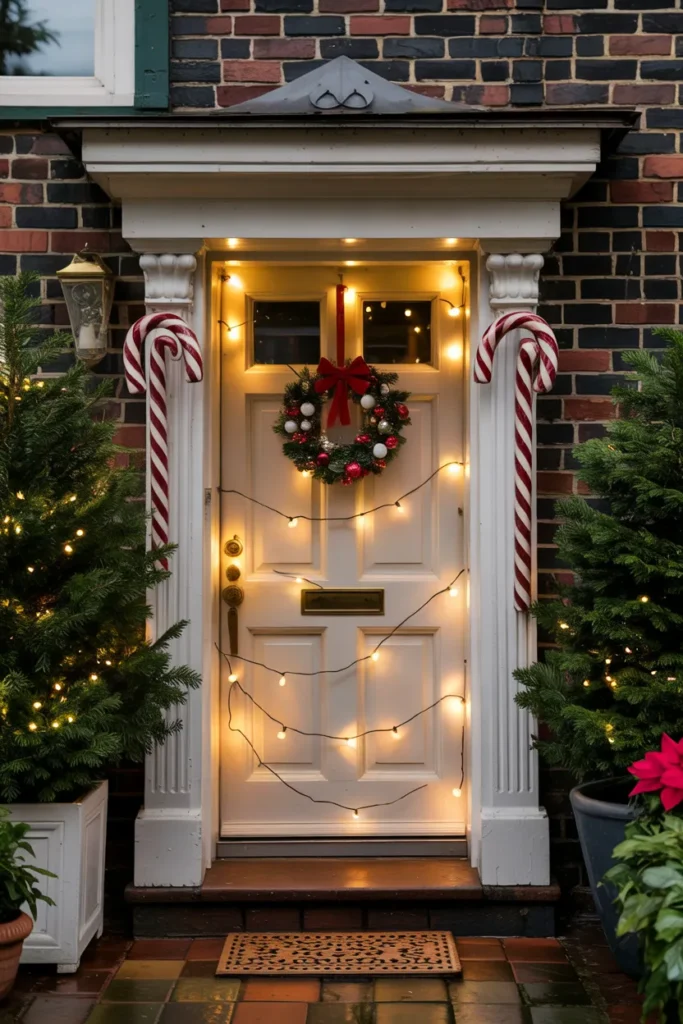 Fairy lights wrapped around candy cane decor create a soft, magical glow. The gentle lighting adds warmth and makes the entrance feel cozy and inviting during winter evenings.