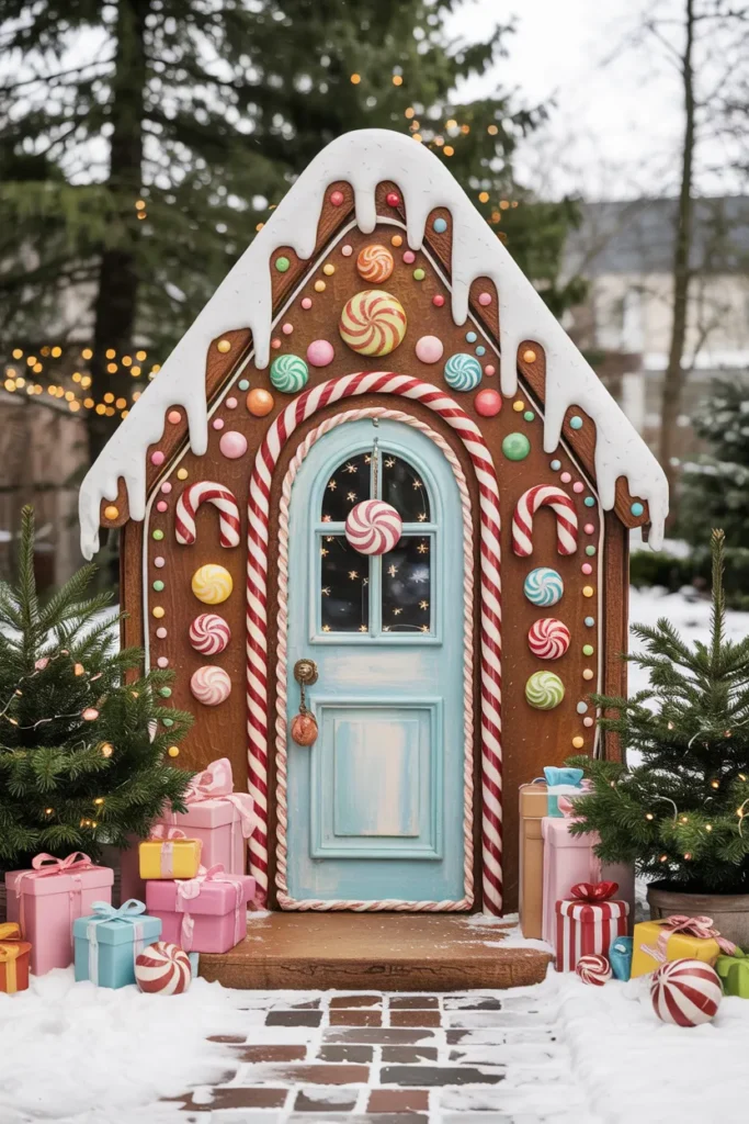 A gingerbread-inspired candy cane door feels playful and full of imagination. Sweet details, soft colors, and gentle lighting bring a storybook quality to the entrance.
