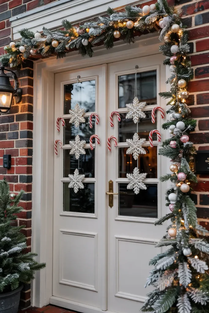Snowflakes paired with candy canes create a delicate winter-inspired entrance. Light tones and frosted textures keep the design airy and refined. The combination feels balanced and visually calming.