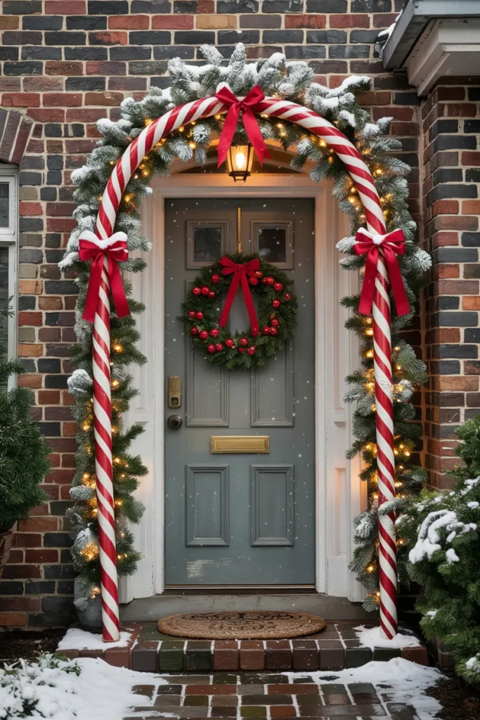 A candy cane arch transforms a doorway into a winter scene. The layered details create depth and drama, making the entrance feel grand and inviting. Soft textures and gentle contrast add elegance.
