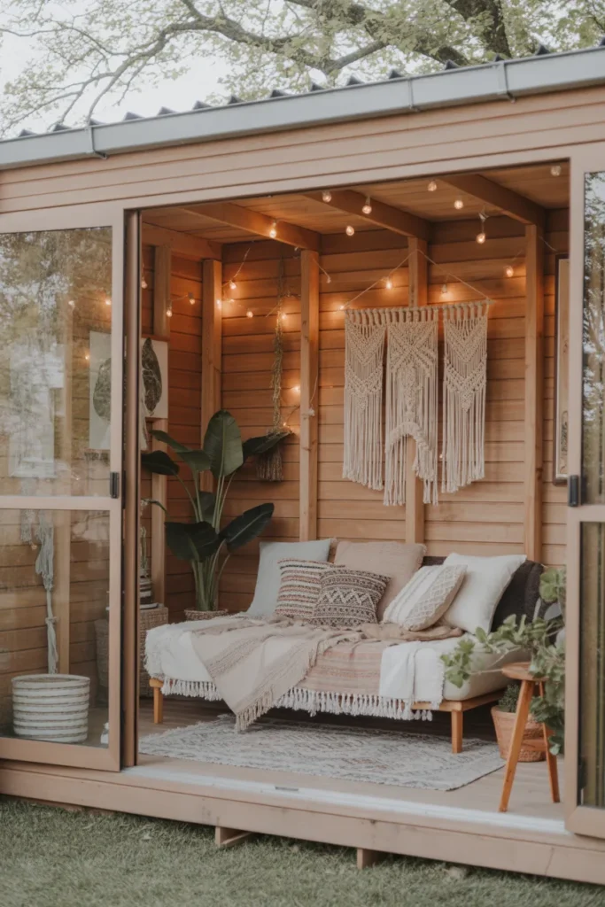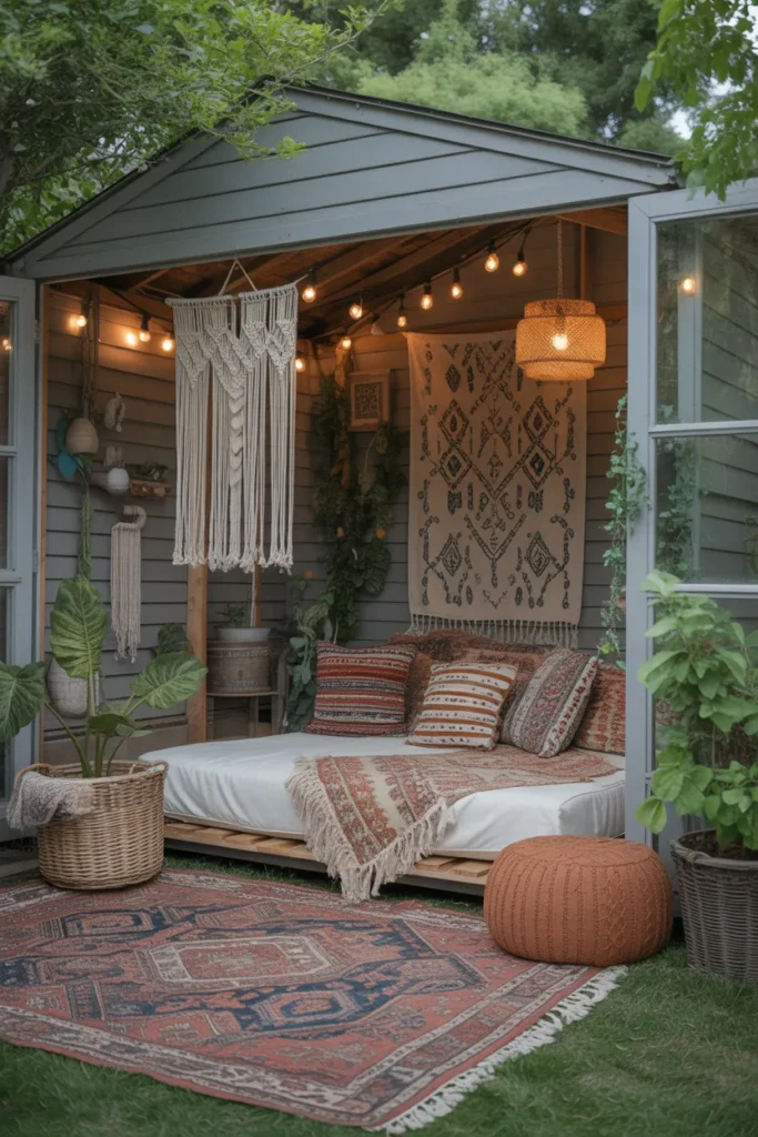 This boho garden shed feels artistic and relaxed, filled with layered textures and soft details. Rugs, fabrics, and handcrafted décor create visual warmth and depth. The space feels inviting and expressive, encouraging comfort and creativity.