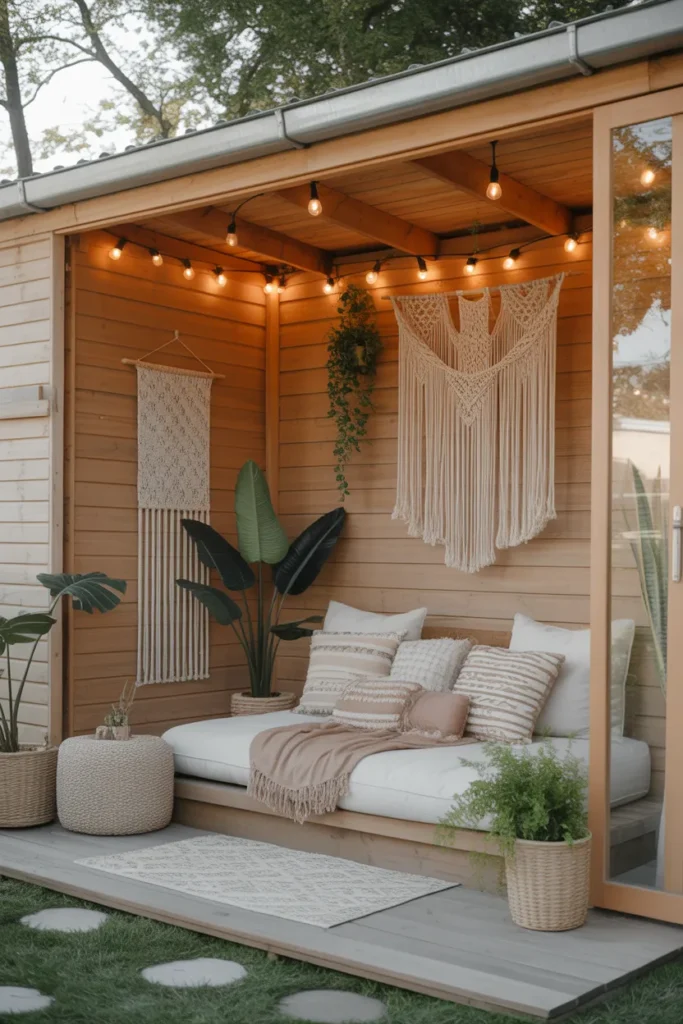 This boho-inspired backyard shed feels relaxed, creative, and full of personality. Natural materials, layered textures, and soft lighting create a welcoming and expressive environment. The space feels informal and warm, encouraging comfort rather than perfection. Every detail adds character and makes the shed feel personal and lived-in.