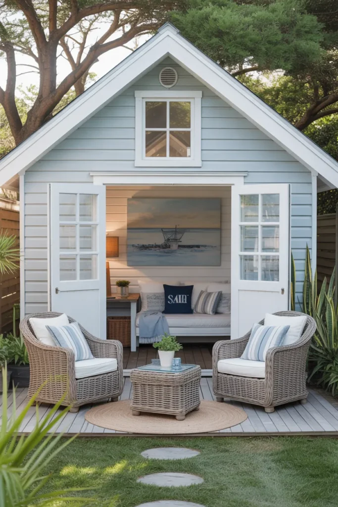 This coastal-inspired backyard shed captures the calm and freshness of seaside living. Soft blue tones and light textures create a breezy, relaxed atmosphere that feels open and peaceful. The design brings a sense of balance and calm to the garden.