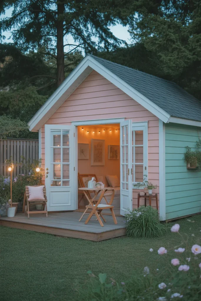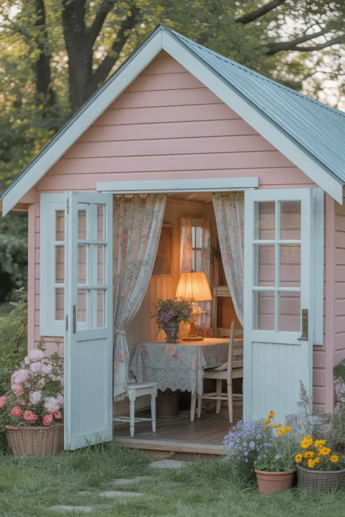 This pastel cottage backyard shed feels like a gentle escape from daily life. Soft mint and blush tones create a warm, welcoming look that instantly soothes the mind. Open doors allow light and fresh air to flow inside, making the space feel bright and comfortable. The overall design blends charm with simplicity, giving the shed a storybook-like presence in the garden.