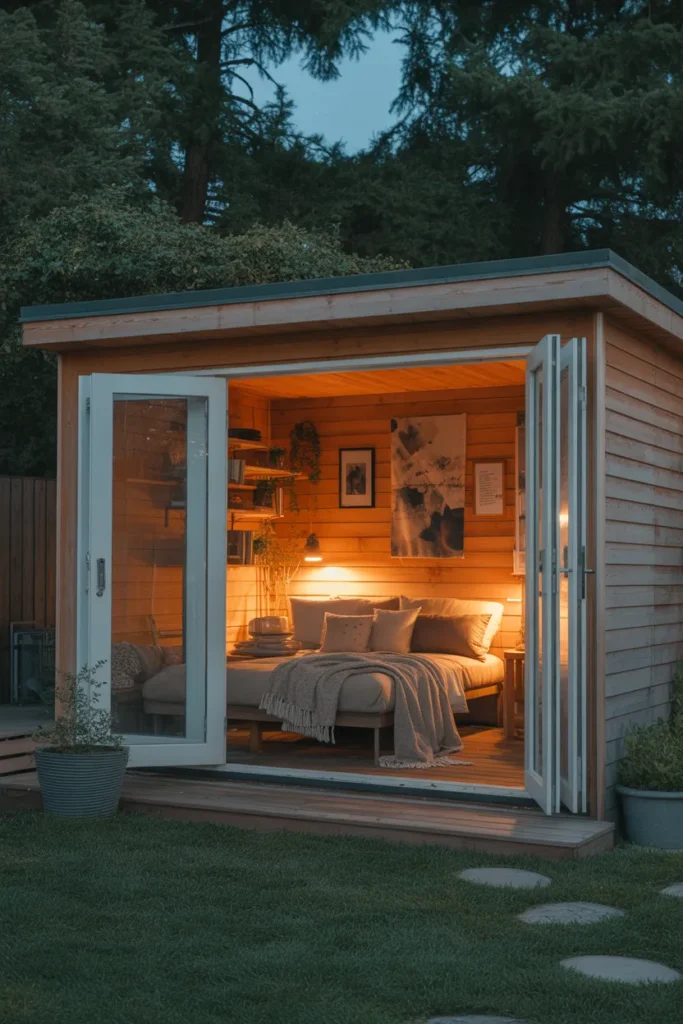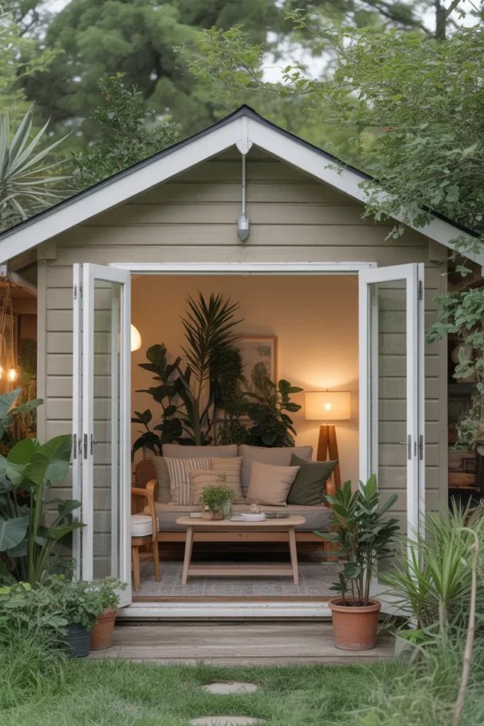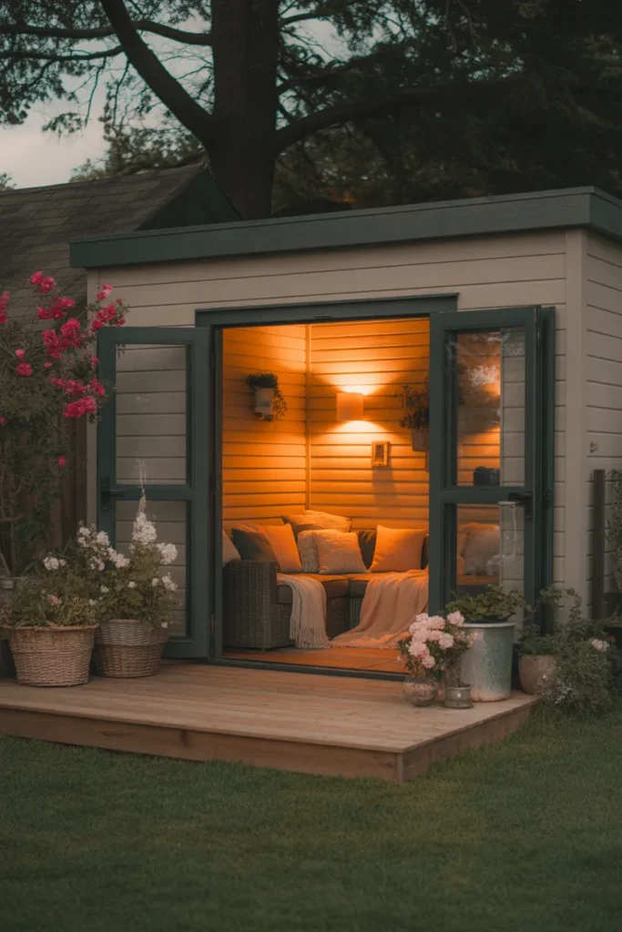 Inside, cozy seating and thoughtful décor make it perfect for relaxing moments. Gentle lighting adds a peaceful glow in the evenings, turning the shed into a quiet retreat ideal for reading, journaling, or enjoying calm garden views.