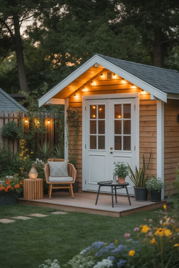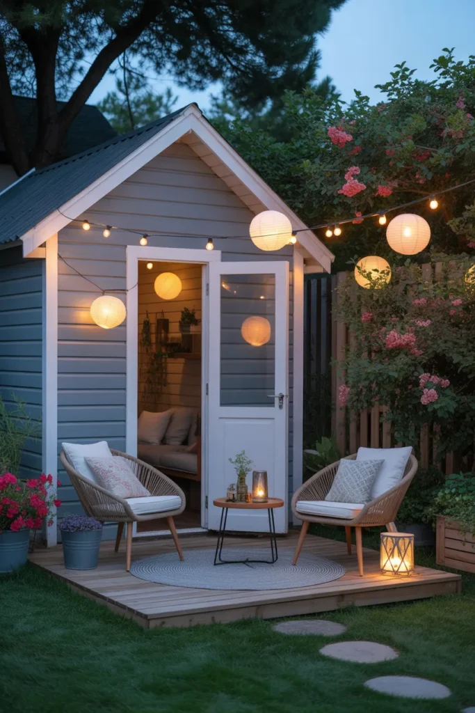 This backyard shed uses hanging lanterns to create a warm and enchanting atmosphere. Soft lighting transforms the space into a cozy retreat, especially in the evening. The gentle glow adds depth and comfort, making the shed feel intimate and relaxing.