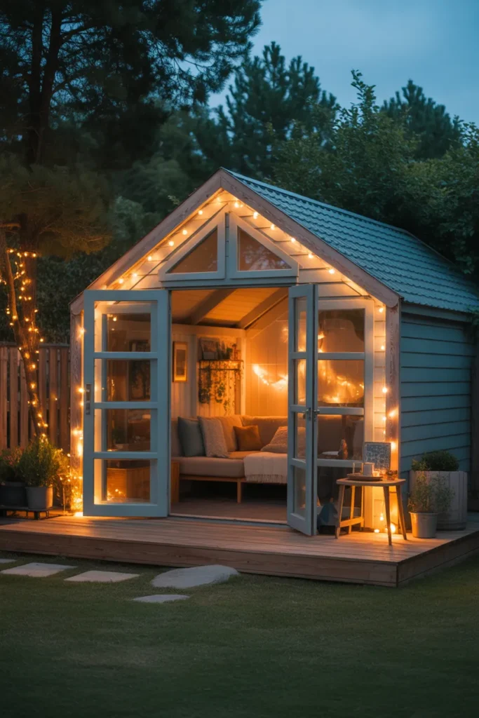 This fairy light backyard shed transforms into a magical retreat as evening arrives. Warm lights wrap the space in a soft glow, creating a calming and intimate atmosphere. The shed feels peaceful and emotionally comforting after sunset.