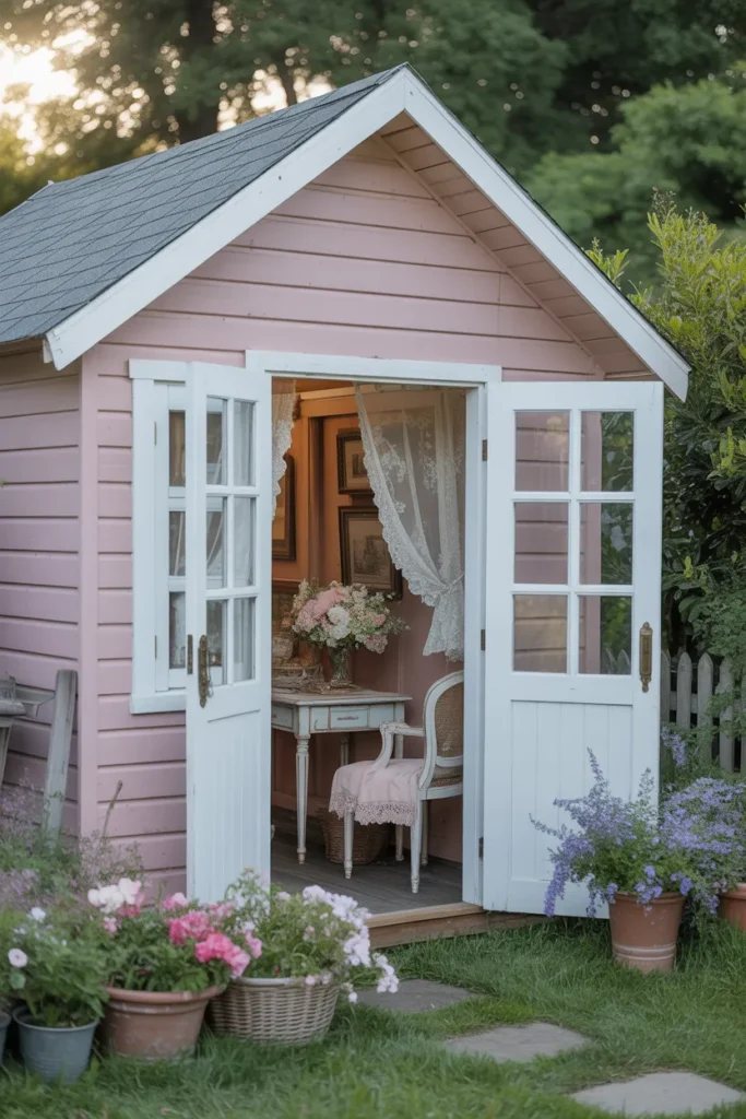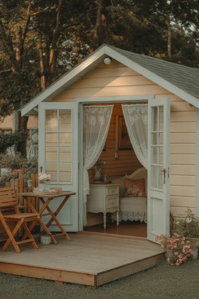 This vintage-chic backyard shed blends elegance with nostalgic charm. Soft colors, classic details, and gentle lighting create a warm and romantic atmosphere. The shed feels timeless, offering comfort through thoughtful design and graceful décor.
