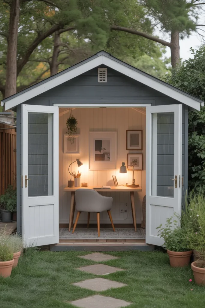 Inside, the peaceful setup supports writing, crafting, or artistic work. Garden views enhance creativity, turning the shed into a quiet space where ideas flow naturally without distraction.