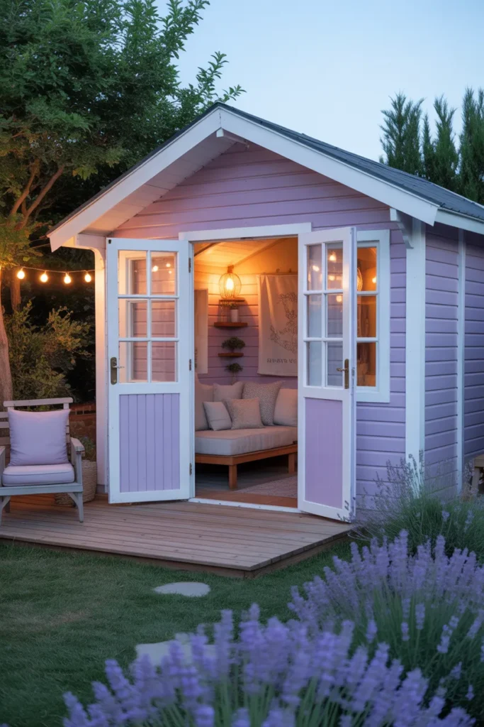 This lavender-themed backyard shed feels dreamy and calming, inspired by soft colors and natural beauty. Gentle lilac tones blend beautifully with surrounding greenery, creating a peaceful and refreshing atmosphere. The shed feels balanced and soothing, making it a perfect garden escape.