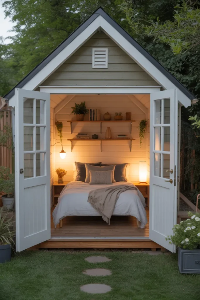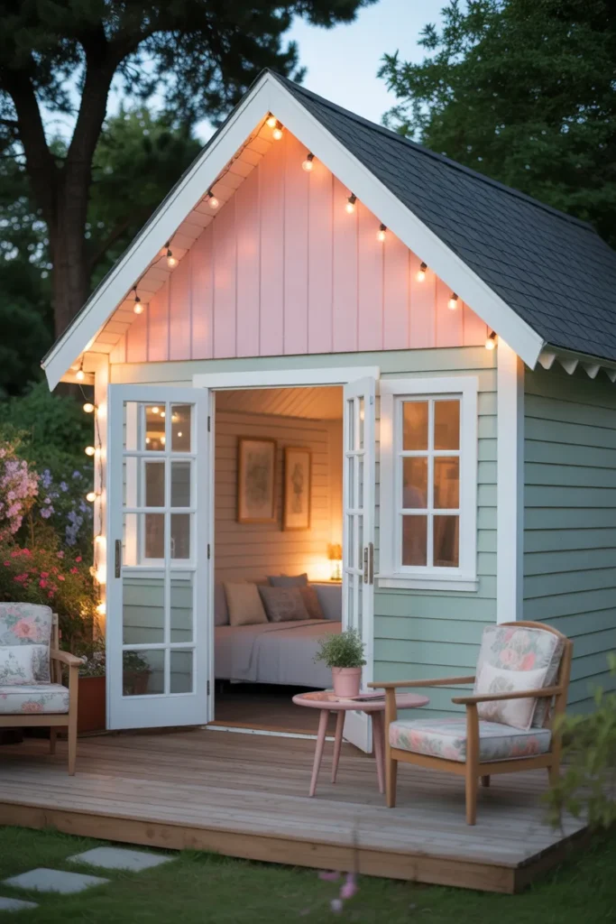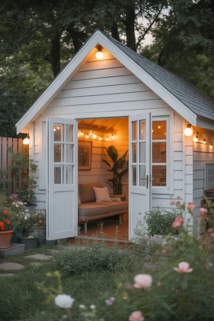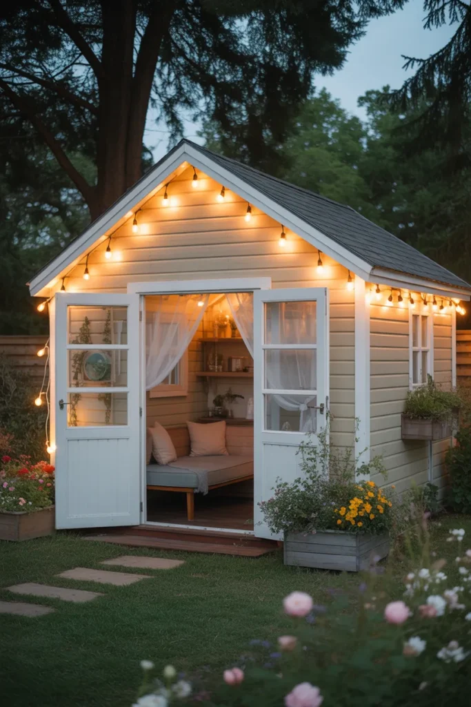 This romantic backyard shed is designed for calm evenings and peaceful moments. Soft colors, flowing details, and gentle lighting create a warm and intimate atmosphere. String lights softly glow after sunset, adding charm and emotional warmth to the space. The shed feels private and comforting, like a hidden garden escape.