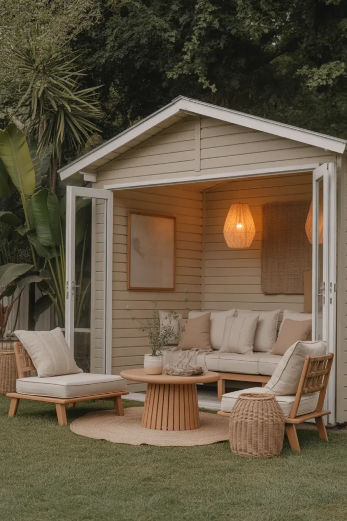 This neutral lounge backyard shed is designed for pure relaxation. Soft seating, warm textures, and calming colors create a soothing atmosphere. The design feels timeless, making the space easy to enjoy in any season.
