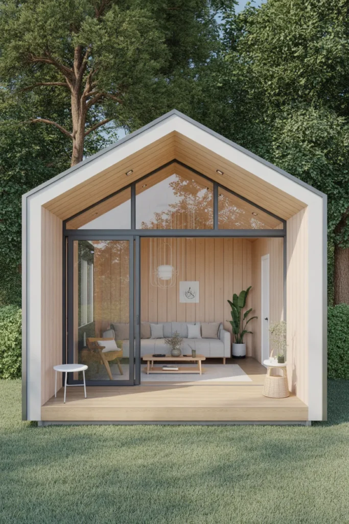 This Scandinavian-style shed focuses on simplicity, light, and functionality. Clean lines and natural materials create a bright, airy feel that keeps the space calm and uncluttered. Large windows invite daylight, enhancing the peaceful atmosphere.