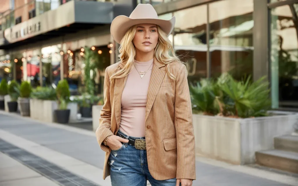 Statement accessories define modern cowgirl fashion. Bold belts, hats, and jewelry transform simple denim outfits into powerful looks.