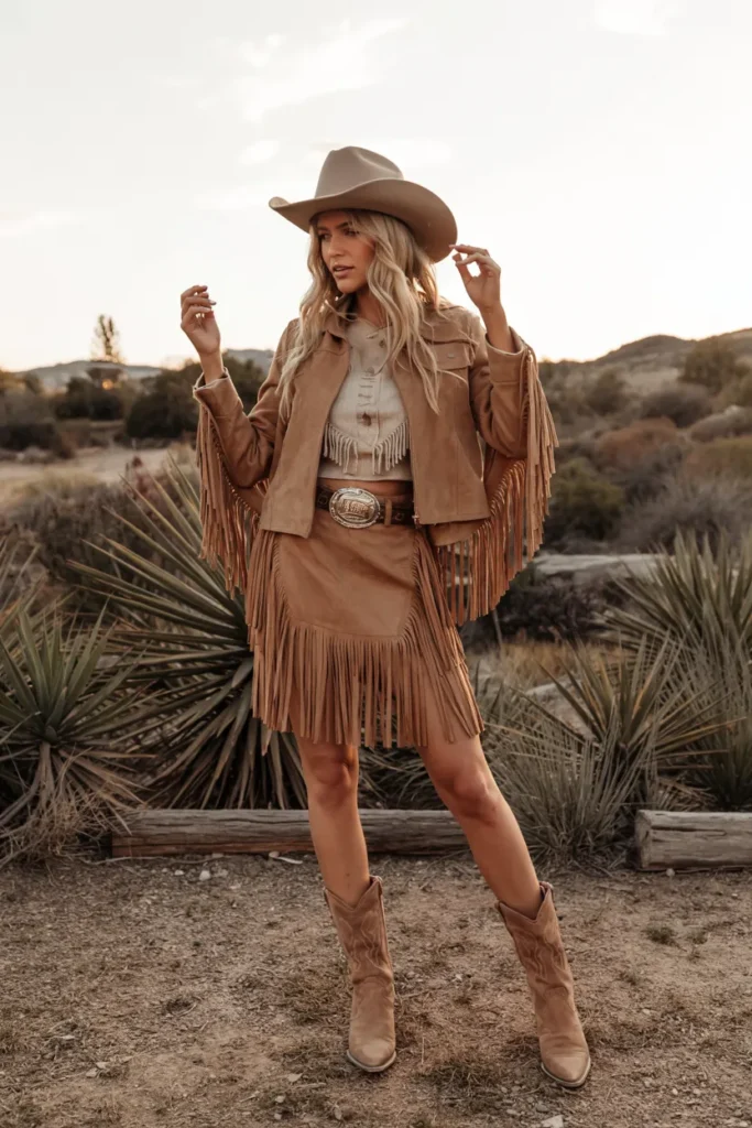 In 2026, outfits that combine texture with structure are especially popular. This look works well for daytime events, festivals, or casual gatherings. The contrast between flowing fringe and a sleek top creates a feminine yet confident western-inspired style.