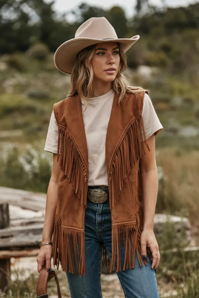 A fringe vest layered over a white tee and jeans delivers an effortless western look. The vest adds texture and personality, while the basic pieces keep the outfit simple and wearable. This combination highlights how small details can transform everyday clothing.