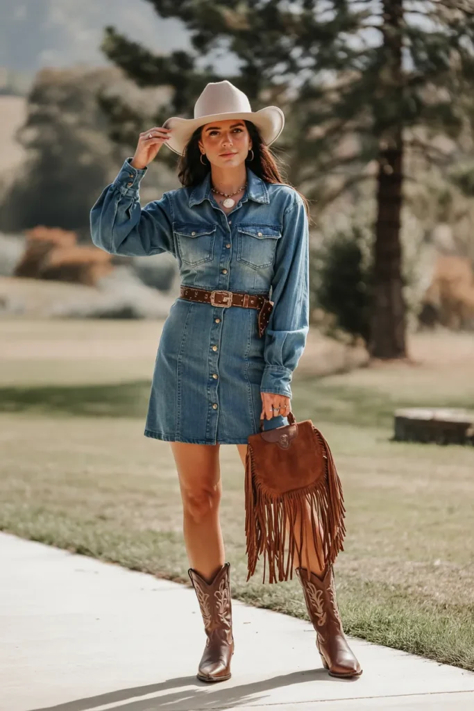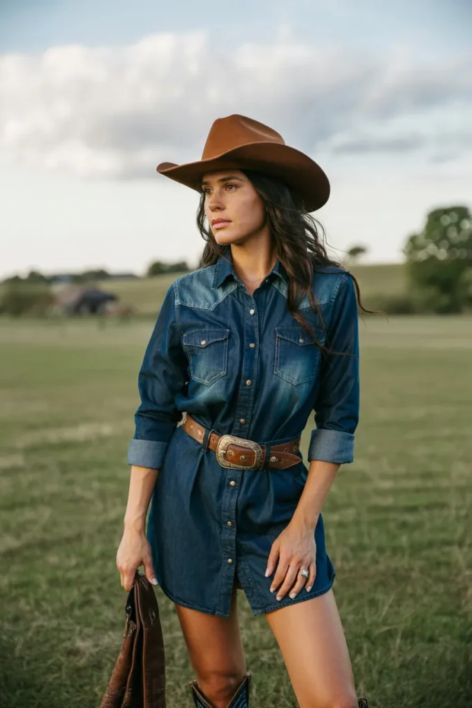 A denim shirt dress offers an effortless one-piece western outfit. Its structured yet relaxed shape pairs naturally with cowboy boots, creating a timeless cowgirl silhouette. Adding a belt enhances the waist and adds polish.