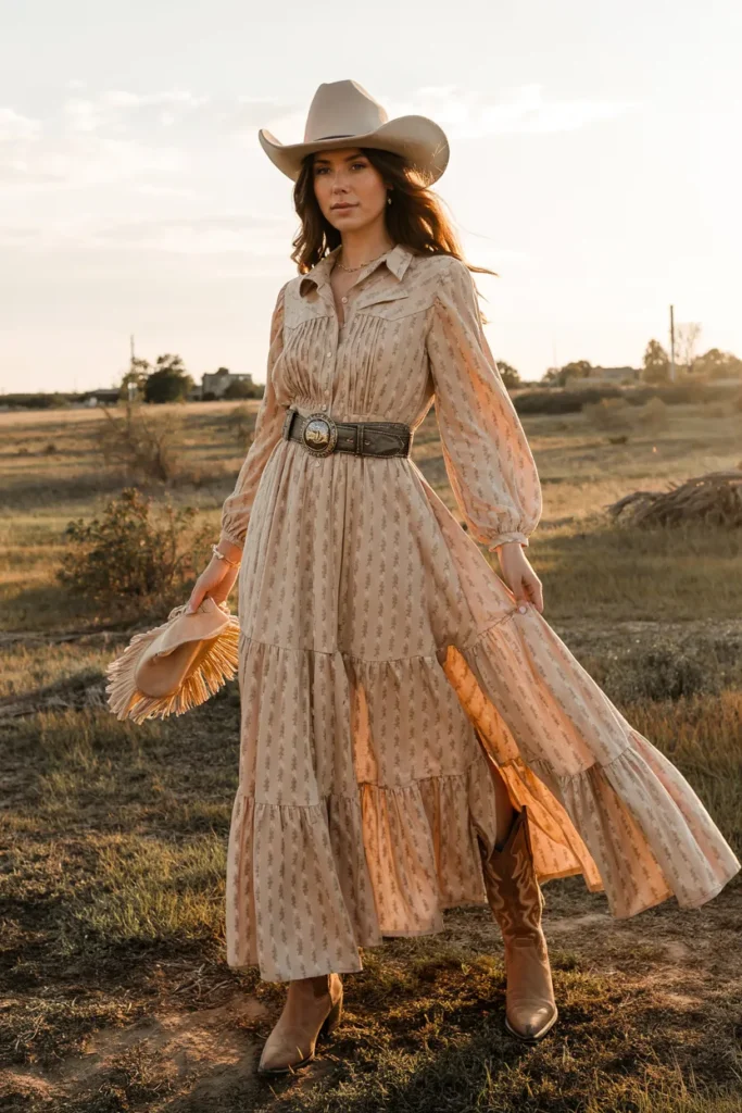 A western-inspired maxi dress offers a soft, romantic approach to cowgirl fashion. Cinching the waist with a denim belt adds structure while keeping the outfit relaxed and comfortable. Flowing fabrics create movement, making the dress suitable for various occasions.