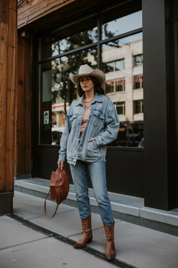 4. Oversized Denim Jacket with Cowboy Boots