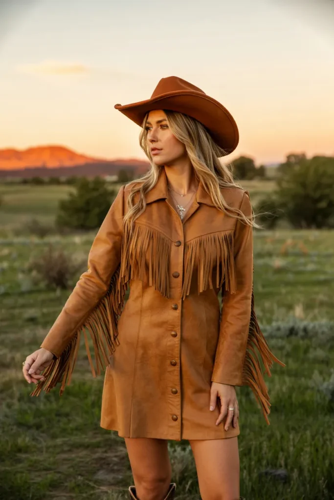 A fringe mini dress delivers playful energy and bold western flair. The fringe creates movement, while the shorter length keeps the look modern and expressive. Cowboy boots ground the outfit in tradition.