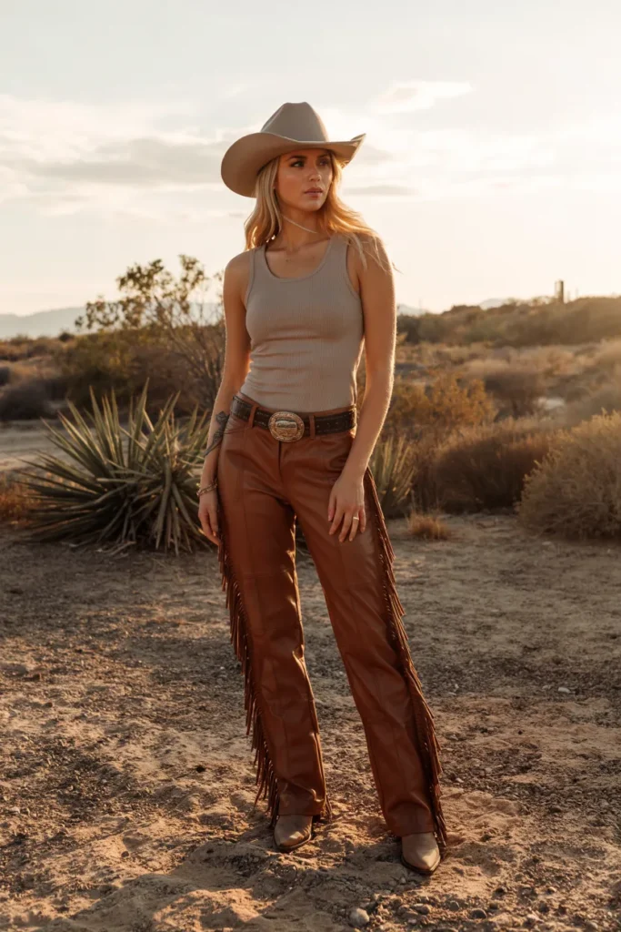 Fringe leather pants make a bold western statement with their dramatic movement and texture. Paired with a simple tank, the outfit remains balanced, allowing the pants to take center stage without feeling overwhelming.